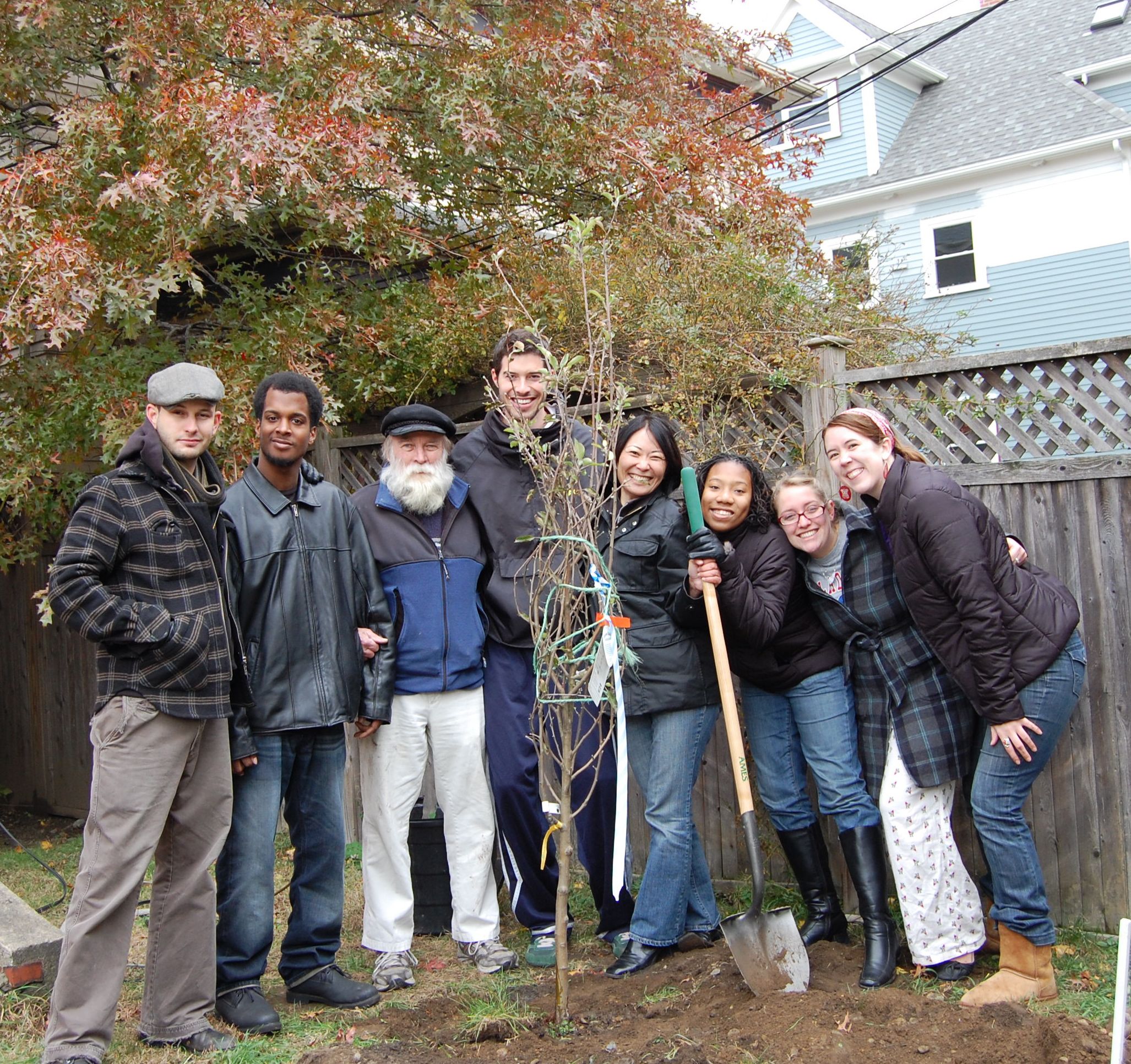 (Photo Courtesy Alison Yoos) (From left) Joseph Leahy, Deni Paynter, Gerry Wright, Jeff Foulkes, Lynn Niizawa, Crystal Carrington, Jess Andersen and Alison Yoos plant an apple tree last November. All—except Wright—are past or present CCI residents.