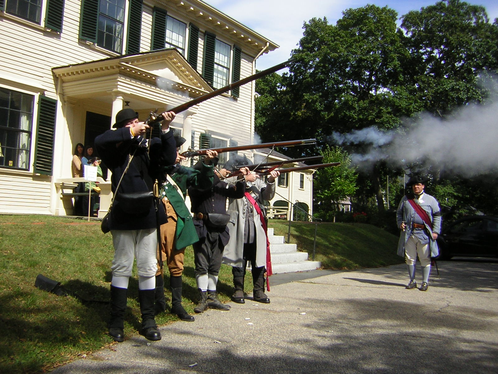)Gazette Photo by John Ruch) Revolutionary War re-enactors fire a volley with their muskets during an event Sept. 17 at the Loring-Greenough House in Monument Square. The re-enactors pay tribute to Gardner’s Regiment, which fought in the Battle of Bunker Hill. Members include JP resident Ed Roche (far right on firing line).