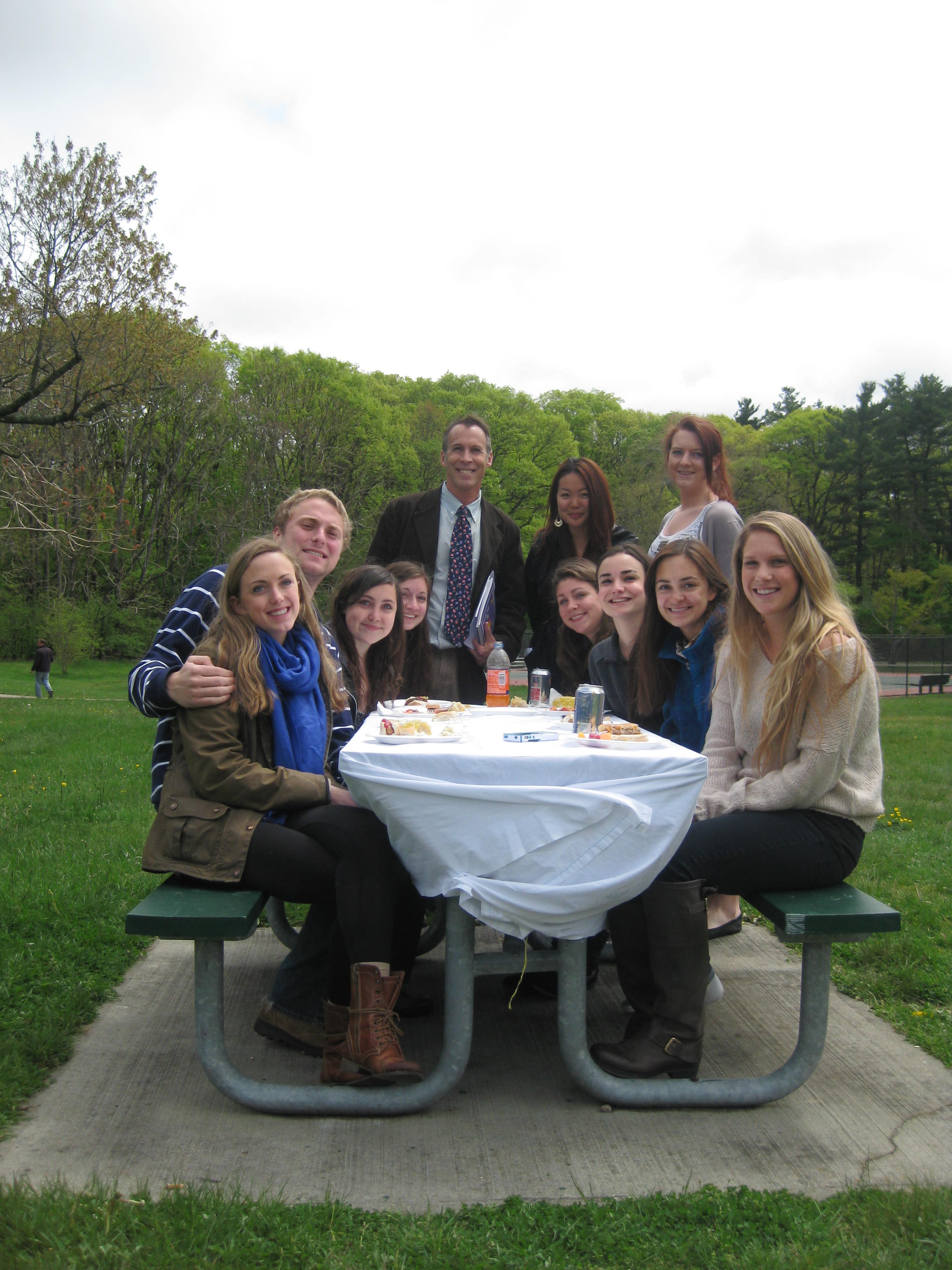 (Courtesy Photo) Students in Boston College’ PULSE Program enjoy a picnic marking the end of their volunteer work with Victory Programs’ Living and Recovery Community program in Franklin Park on May 2. The students worked with Shattuck Hospital residents who have HIV/AIDS and substance abuse and mental health issues. Pictured are (from left) Austin Hughes, Ryan McGuill, Julie Beigner, Taylor Stiegler, Victory Programs President and CEO Jonathan Scott, Lyan Chung (standing), Mary Sheehy (standing), Katie Oskar, Laura Banu, Alexandra Simpson and Kathryn McKennon. Local state Rep. Liz Malia (not pictured) also attended and praised the students.
