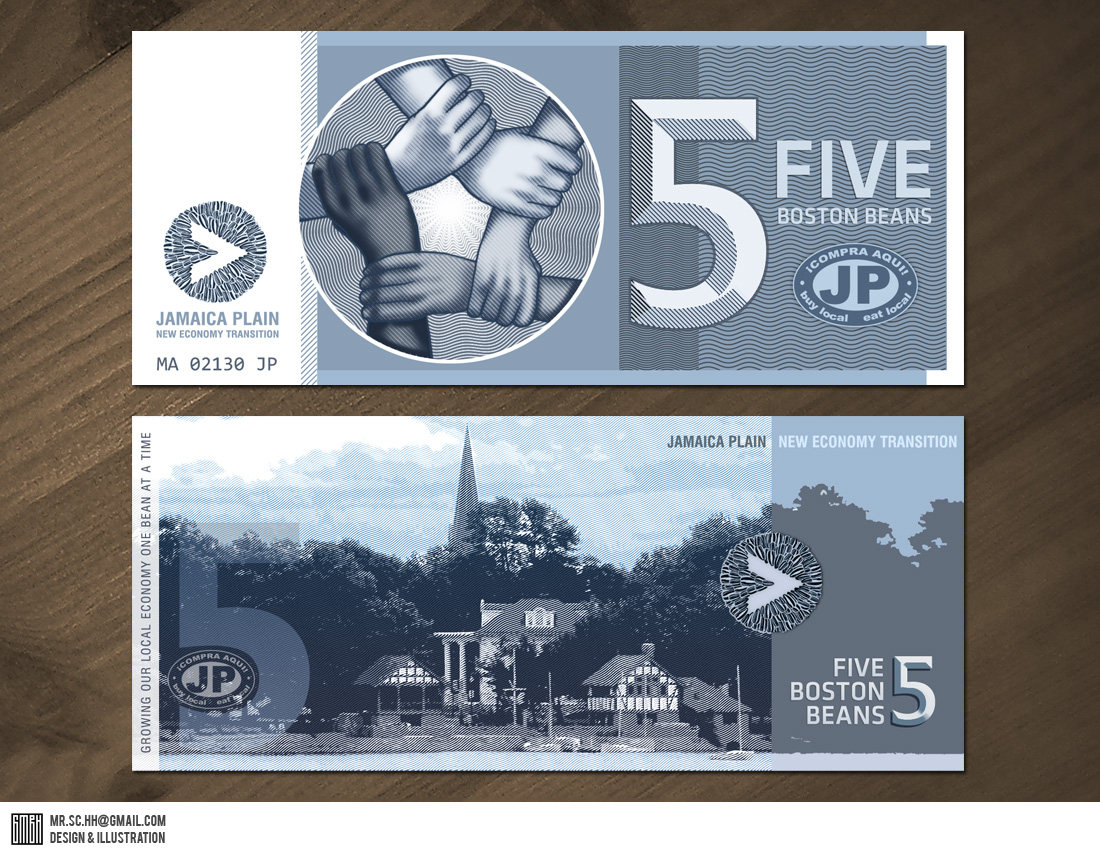Local currency is make-believe money—like Disney Dollars or Monopoly money—that is backed by real money but only accepted in certain areas. “Boston Beans” will only be accepted in Jamaica Plain.