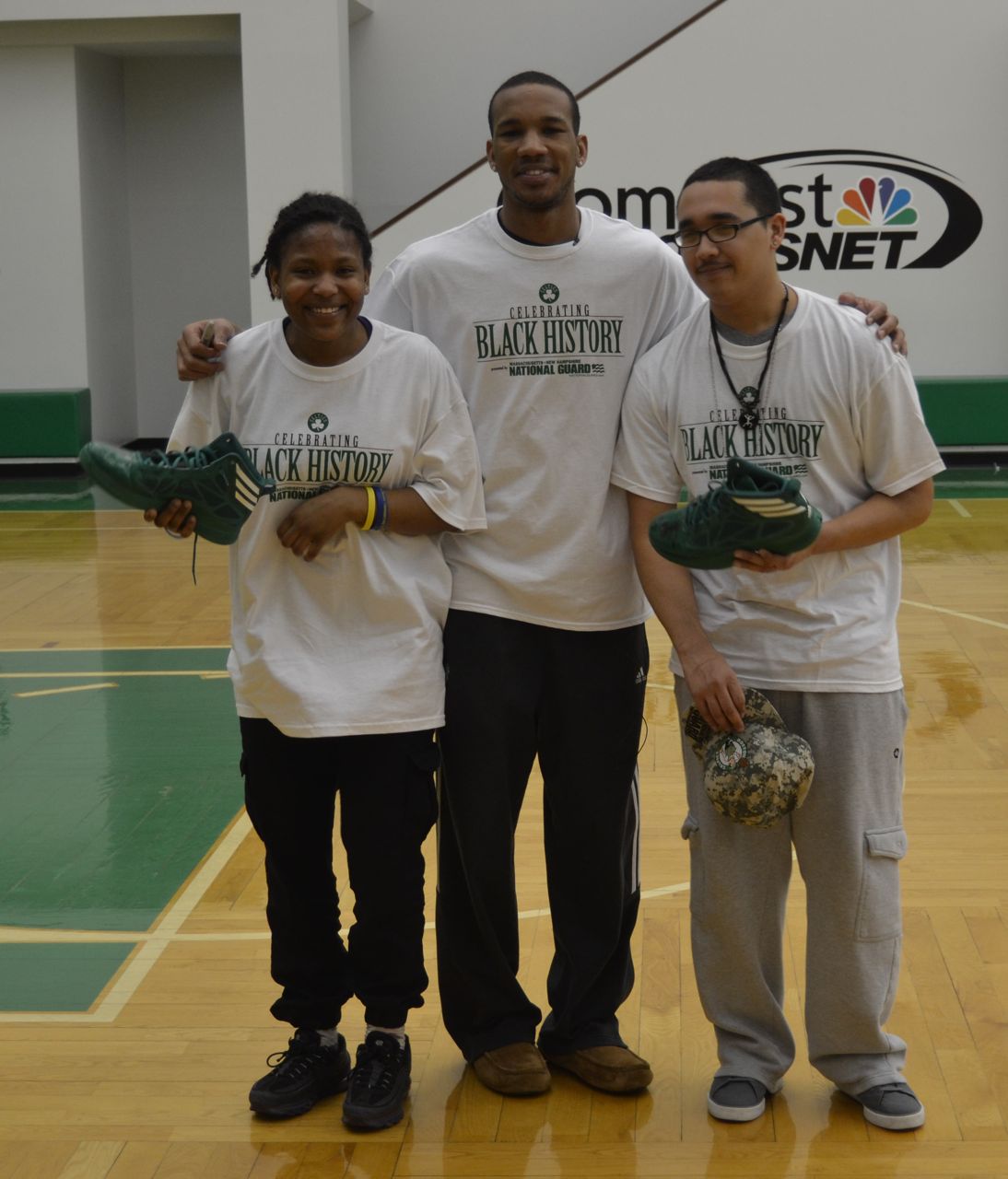 (Courtesy Photo) English High School Army JROTC Cadet Miasia Kemp (left) and Cadet Executive Officer Jorge Maldonado hold shoes signed by Boston Celtics basketball player Avery Bradley (center) during a Black History Month event at the Celtics practice facility in Waltham Feb. 28. Twenty cadets attended the event, hosted by the Celtics and the Massachusetts National Guard, where they talked and shot hoops with Avery and former Celtics players and played a Black History trivia game.