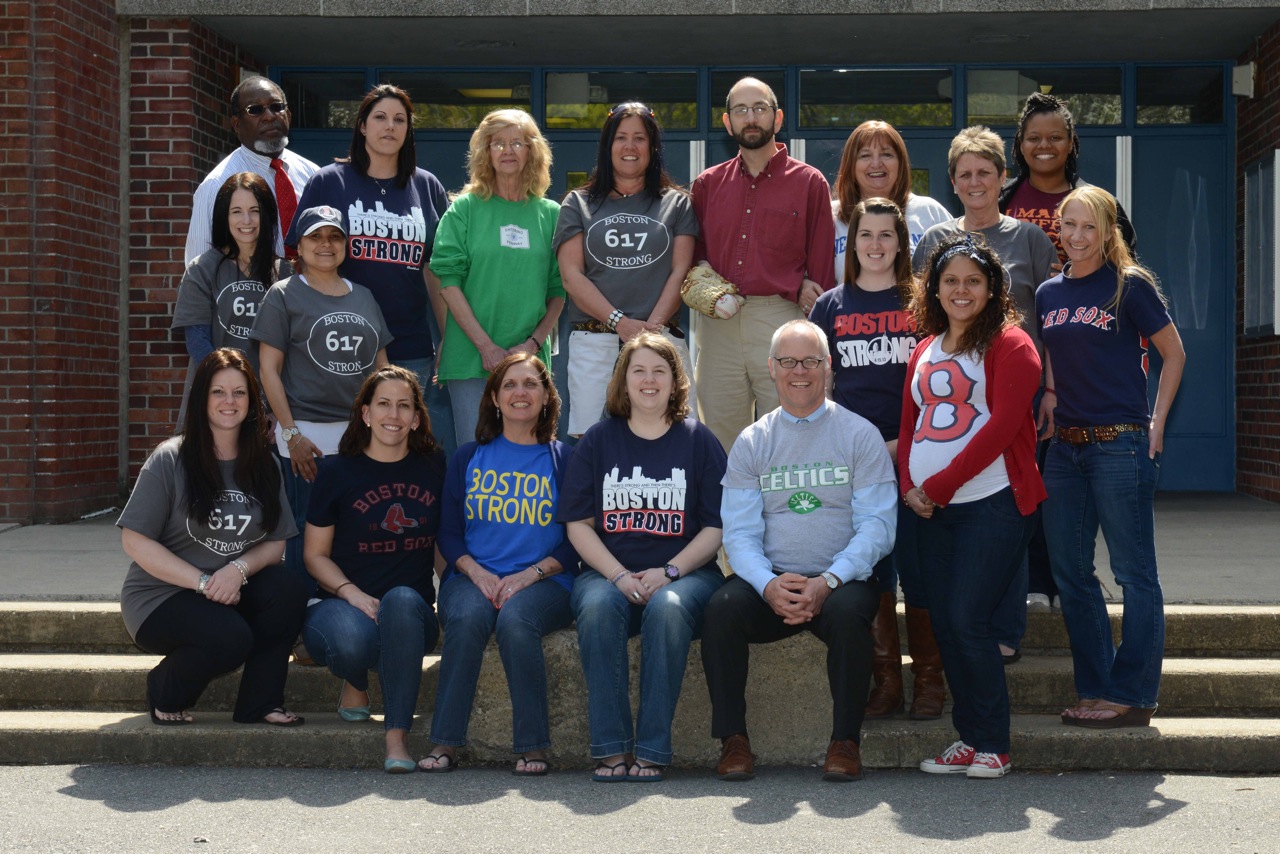 (Courtesy Photo) Teachers and staff at the Manning Elementary School in Jamaica Hills show their Boston pride on April 26, when they and others raised $350 for The One Fund benefiting Boston Marathon bombing victims. Pictured, from left, are: (front row) Michelle Scansaroli, Corey Lubin, Secretary Cheryl Pastore, Shannon Windus, Principal Ethan d’Ablemont Burnes and Luisa Cruz; (middle row) Kristen Chaplin, Maria Karloutsos, Claire O’Donoghue and Nicole Vanderheiden; (back row) Special Education Administrator Marvin Mitchell, Dakota Bonilla, Leona Cook, Juli Rice, Robert Demerjian, Teri Cunningham, Patti Cahill and Macquin Brockington.