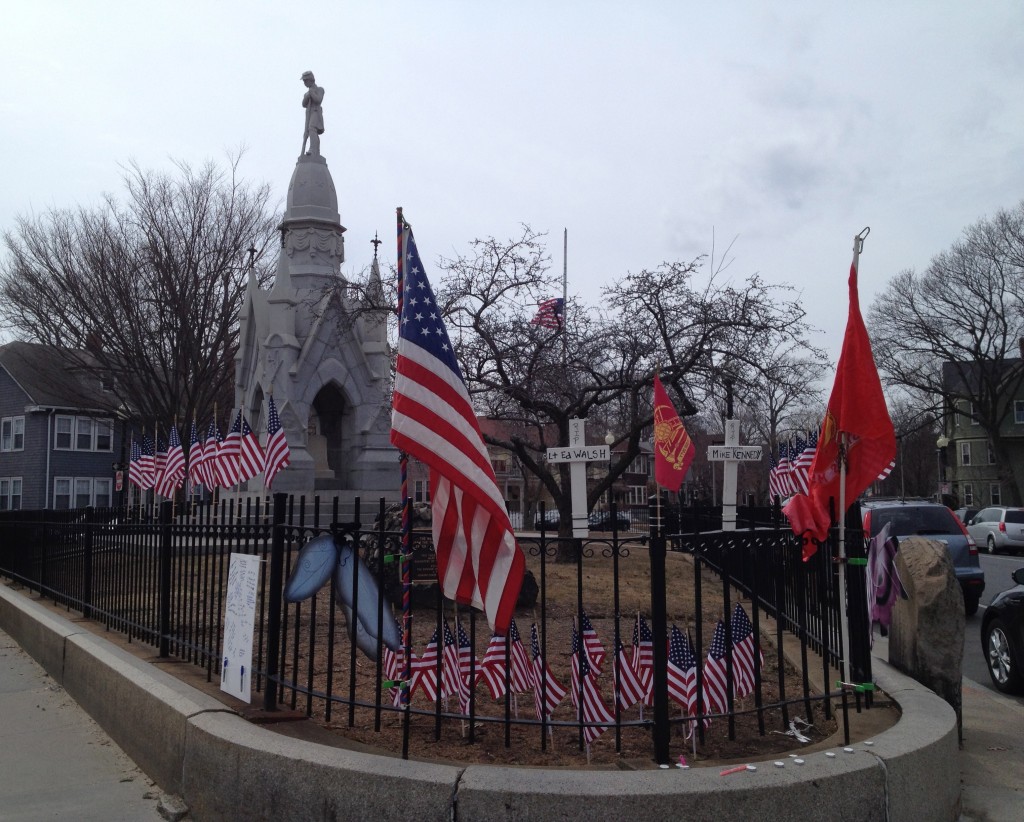 A memorial to two firefighters killed in a March 26 Back Bay fire was created at the Soldier’s Monument in Monument Square on March 28 by Carlos Arredondo, a well-known Roslindale peace activist and Boston Marathon bombing rescue hero. American flags, a firefighters’ flag, wings and white crosses bearing the names of Fire Lt. Edward J. Walsh Jr., 43, and Firefighter Michael R. Kennedy, 33, were prominently arranged. Arredondo has created several makeshift memorials in Monument Square in recent years, including for the marathon bombing and the Sandy Hook school shooting. (Gazette Photo by Rebeca Oliveira)