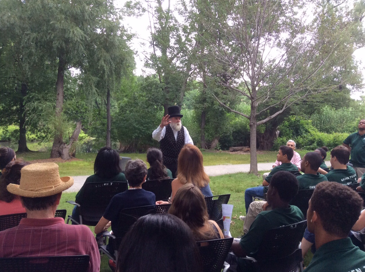 JP resident Gerry Wright plays famed Emerald Necklace Park system designer Frederick Law Olmsted during an event at the Back Bay’s Shattuck Visitor Center on July 14. The event was a kick-off for Wright, who is traveling to Yosemite National Park and will visit many city, state and national parks on his journey. Wright was invited to Yosemite to celebrate the 150th anniversary of the Yosemite Report, which was written by Olmsted about preserving the area as a forerunner of the U.S. National Park system. (Courtesy Photo)